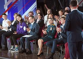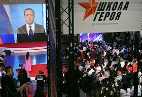 Первый форум "Школа героев", организованный партией "Единая Россия" совместно с Министерством просвещения России в Музее Победы на Поклонной горе. Выступление заместителя председателя Совета Безопасности России, председателя партии "Единая Россия" Дмитрия Медведева (на экране) на форуме.