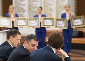 Первый форум "Школа героев", организованный партией "Единая Россия" совместно с Министерством просвещения России в Музее Победы на Поклонной горе. Помощник президента России Владимир Мединский (слева) и председатель комитета Государственной думы России по информационной политике, информационным технологиям и связи Александр Хинштейн (в центре) на церемонии гашения почтовой марки, посвященной героям России, участникам специальной военной операции, в рамках первого форума "Школа героев".