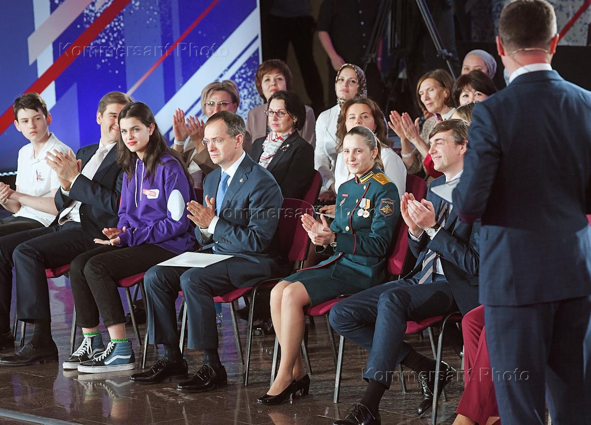 Первый форум "Школа героев", организованный партией "Единая Россия" совместно с Министерством просвещения России в Музее Победы на Поклонной горе. Помощник президента России Владимир Мединский (в центре) на форуме.