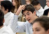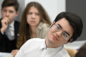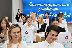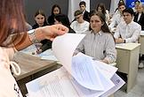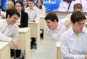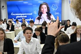 Первый очный диктант на знание Конституции России среди школьников, организованный Российским движением школьников, в Государственном бюджетном общеобразовательном учреждении города Москвы "Школа № 1231 имени В.Д. Поленова". Учащиеся во время диктанта.