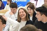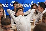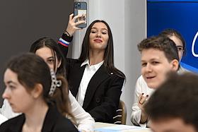 Первый очный диктант на знание Конституции России среди школьников, организованный Российским движением школьников, в Государственном бюджетном общеобразовательном учреждении города Москвы "Школа № 1231 имени В.Д. Поленова". Учащиеся и президент благотворительного фонда "Спешите делать добро", телеведущая Оксана Федорова (в центре слева) во время диктанта.