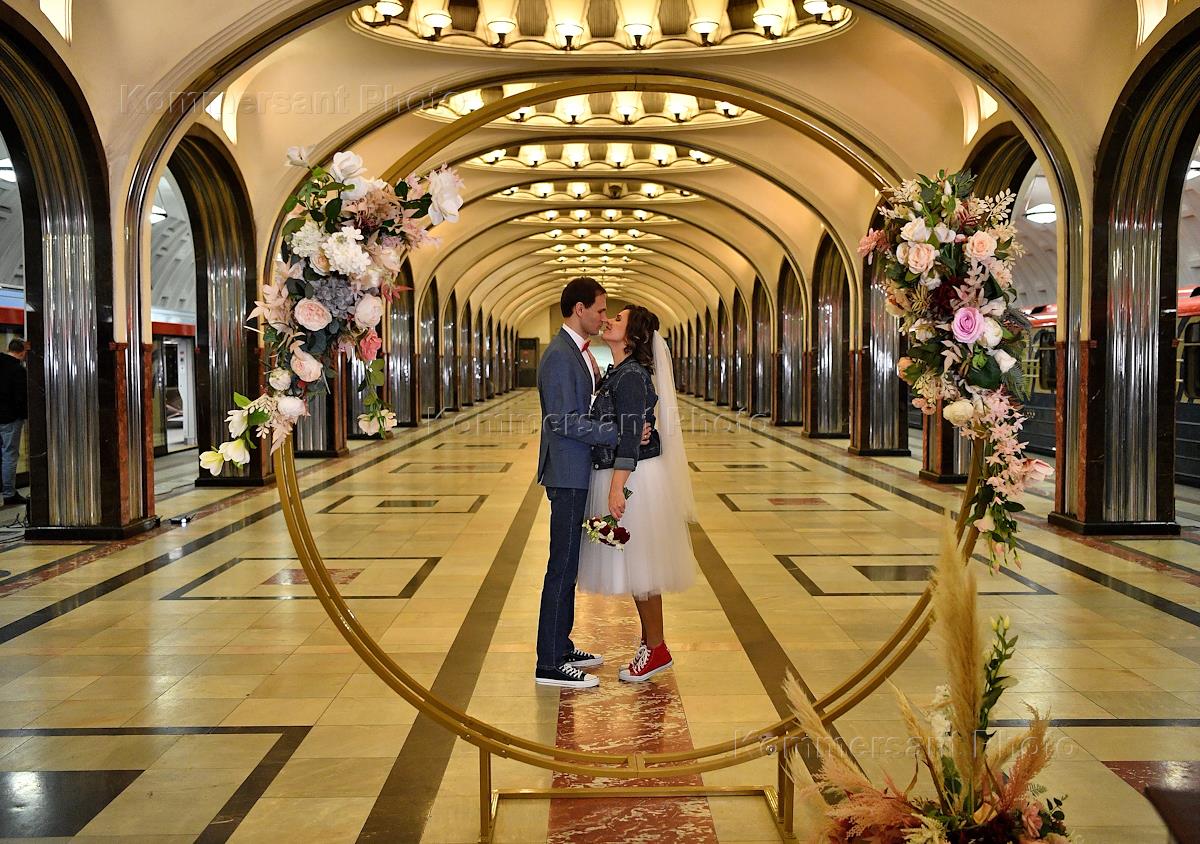 Свадебная церемония в Московском метрополитене на станции "Маяковская" в рамках проекта мэра Москвы Сергея Собянина "Новые адреса счастья". Невеста и жених в вестибюле станции метро во время церемонии.
