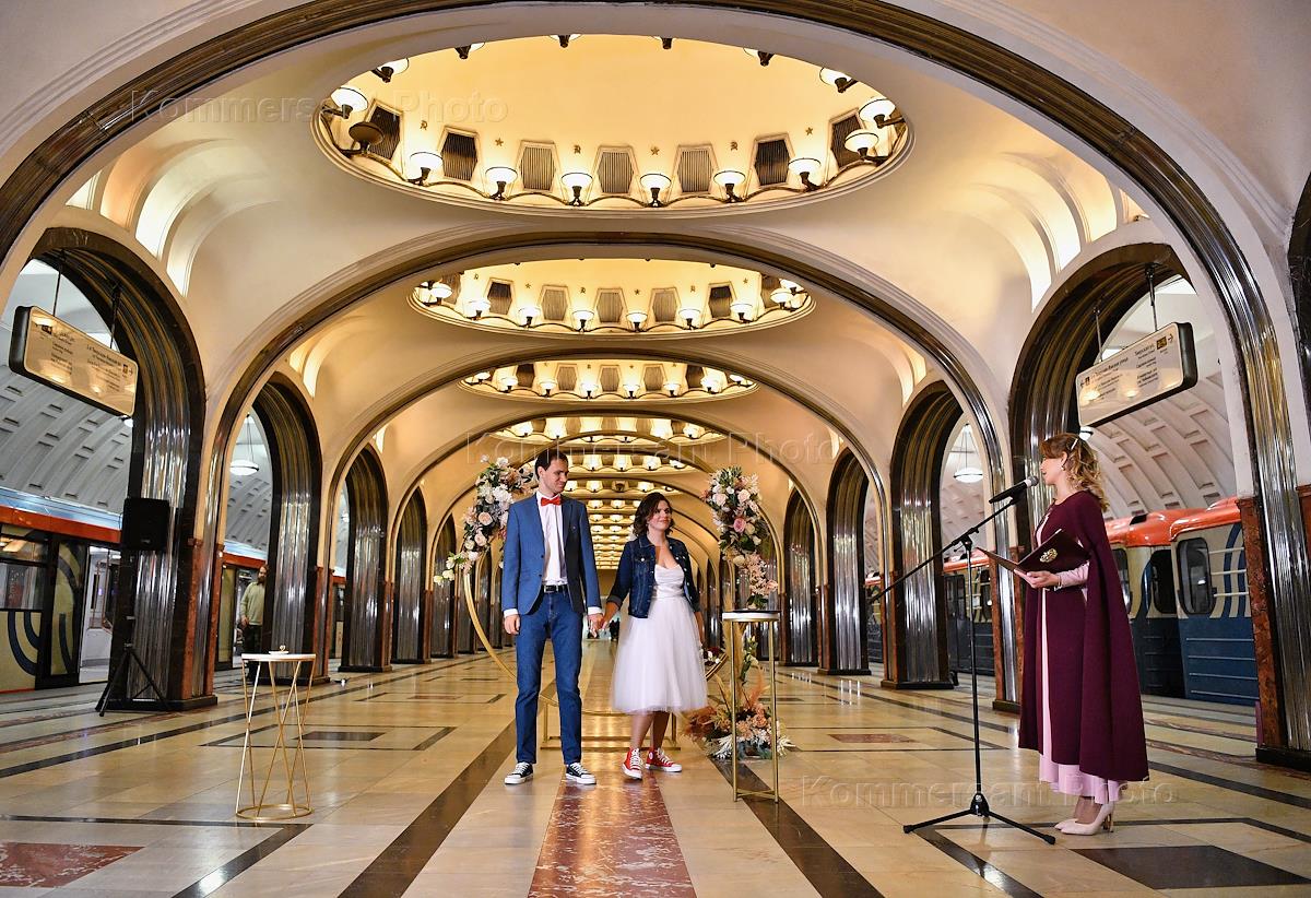 Свадебная церемония в Московском метрополитене на станции "Маяковская".