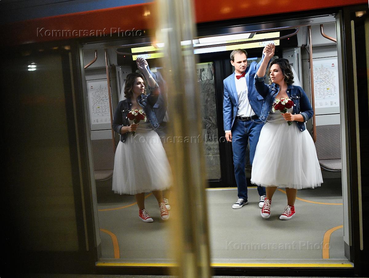 Свадебная церемония в Московском метрополитене на станции "Маяковская" в рамках проекта мэра Москвы Сергея Собянина "Новые адреса счастья". Невеста и жених в вагоне метро во время церемонии.