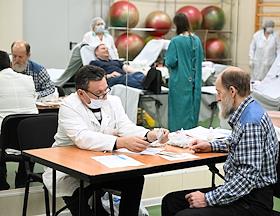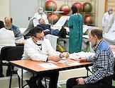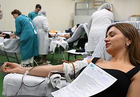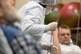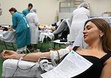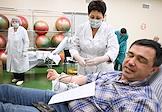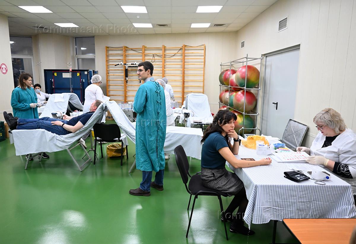 Донорская акция в рамках V общероссийской недели IT-донора в здании главного вычислительного центра – филиала ОАО "РЖД". Акция проводится совместно с ФГКУ "1586-й военный клинический госпиталь МО РФ" города Подольска. Жанровая фотография.