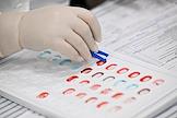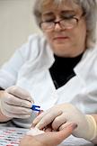 Донорская акция в рамках V общероссийской недели IT-донора в здании главного вычислительного центра – филиала ОАО "РЖД". Акция проводится совместно с ФГКУ "1586-й военный клинический госпиталь МО РФ" города Подольска. Медицинский работник во время определения группы крови у участника акции.