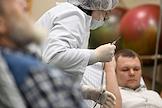 Донорская акция в рамках V общероссийской недели IT-донора в здании главного вычислительного центра – филиала ОАО "РЖД". Акция проводится совместно с ФГКУ "1586-й военный клинический госпиталь МО РФ" города Подольска. Медицинский работник во время забора крови у участника акции.
