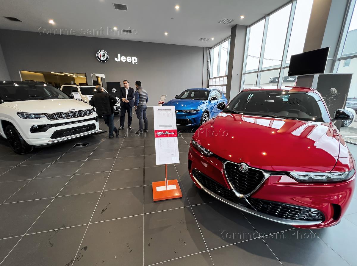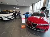 Жанровая фотография. Посетители в автосалоне по продаже автомобилей Jeep и Alfa Romeo.