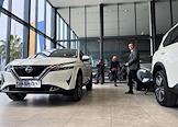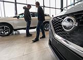 Жанровая фотография. Посетители в автосалоне про продаже автомобилей Nissan.
