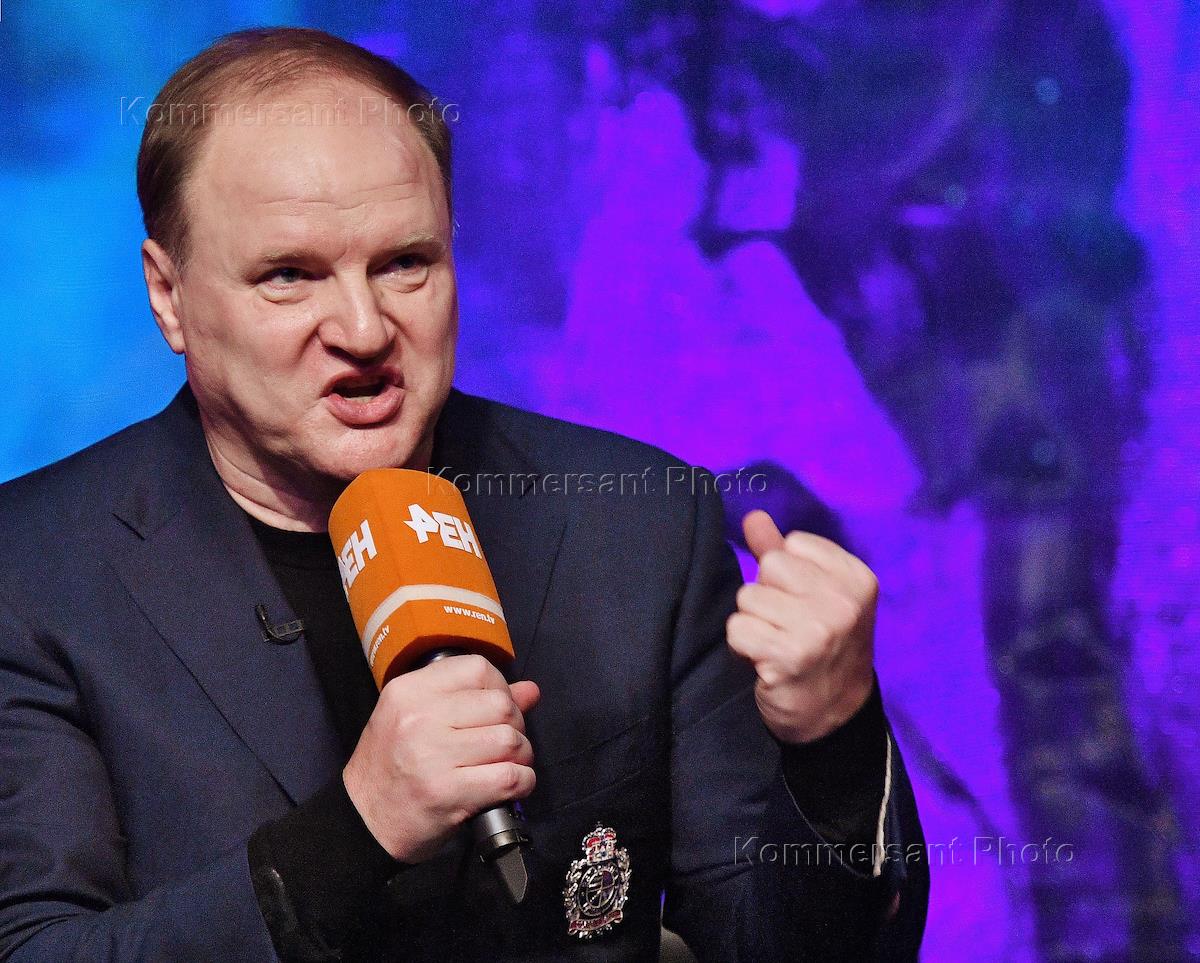 Пресс-конференция участников турнира "Бойцовский клуб РЕН ТВ. Суперсерия" в пресс-центре МИЦ "Известия". Промоутер турнира Владимир Хрюнов во время пресс-конференции.