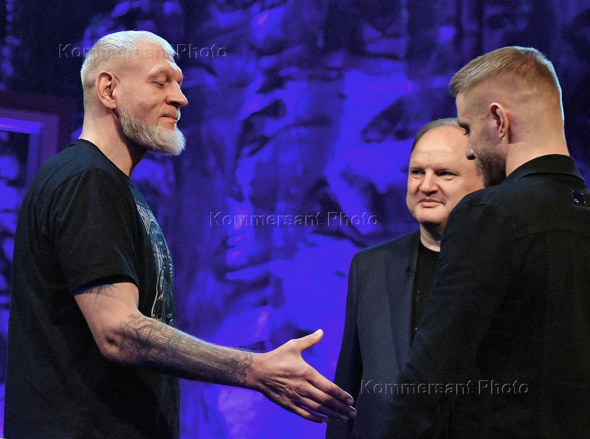 Пресс-конференция участников турнира "Бойцовский клуб РЕН ТВ. Суперсерия" в пресс-центре МИЦ "Известия". Слева направо: российский боец смешанных единоборств Александр Емельяненко, промоутер турнира Владимир Хрюнов и российский боец смешанных единоборств Святослав Коваленко во время пресс-конференции.