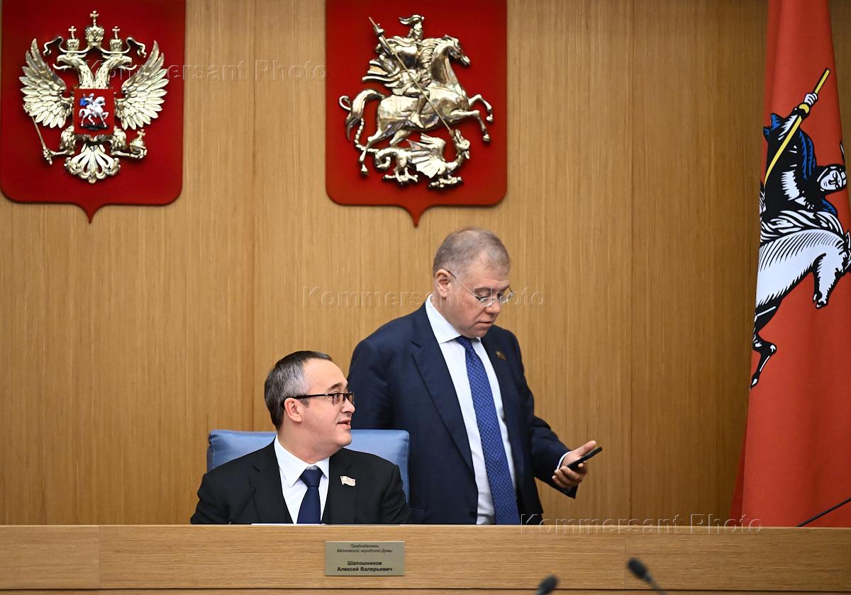 Заседание Моcковской городской думы (Мосгордумы). Председатель Мосгордумы Алексей Шапошников (слева) во время заседания.