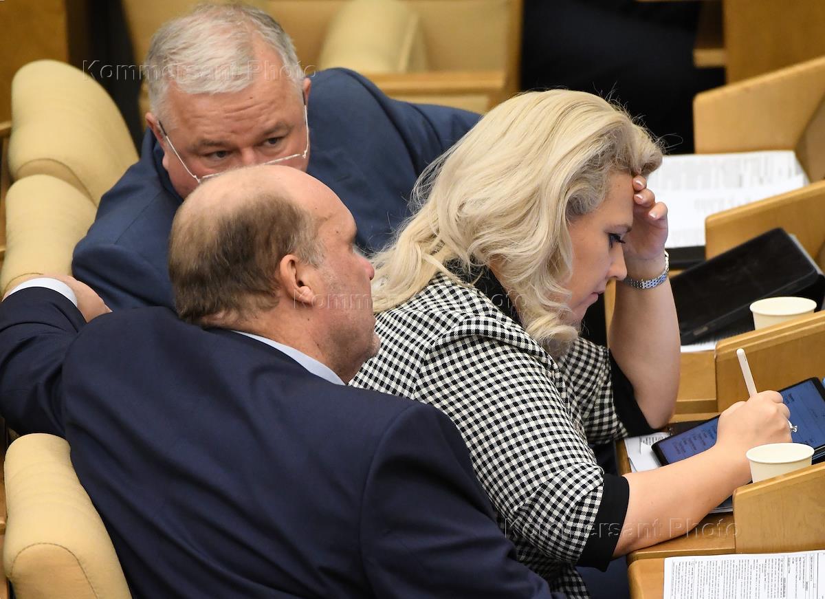Пленарное заседание Государственной думы (ГД) России. Член комитета ГД России Ольга Германова (слева), председатель комитета ГД России по развитию гражданского общества, вопросам общественных и религиозных объединений Ольга Тимофеева (в центре) и член комитета ГД России по аграрным вопросам Алексей Лавриненко (справа) во время заседания.