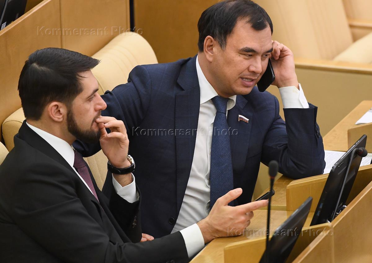 Пленарное заседание Государственной думы (ГД) России. Заместитель председателя комитета ГД России по обороне Юрий Швыткин (слева) и член комитета ГД России по строительству и жилищно-коммунальному хозяйству Марат Нуриев (справа) во время заседания.