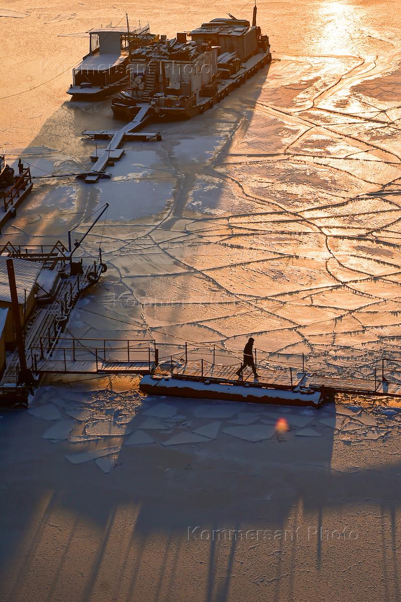Жанровая фотография. Вид лодочной станции на реке Обь во время рассвета во время морозов в Новосибирске.