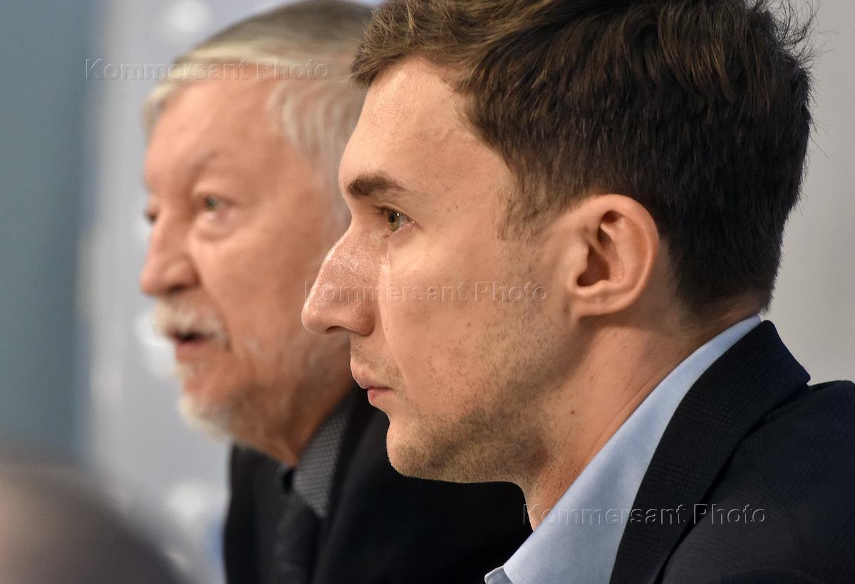 Пресс-конференция вице-чемпиона мира Сергея Карякина и многократного чемпиона мира Анатолия Карпова в преддверии выборов президента Федерации шахмат России (ФШР) 17 декабря 2022 года в пресс-центре ТАСС. Член комитета Государственной думы России по науке и высшему образованию Анатолий Карпов (в центре) и шахматист Сергей Корякин (слева) во время пресс-конференции.