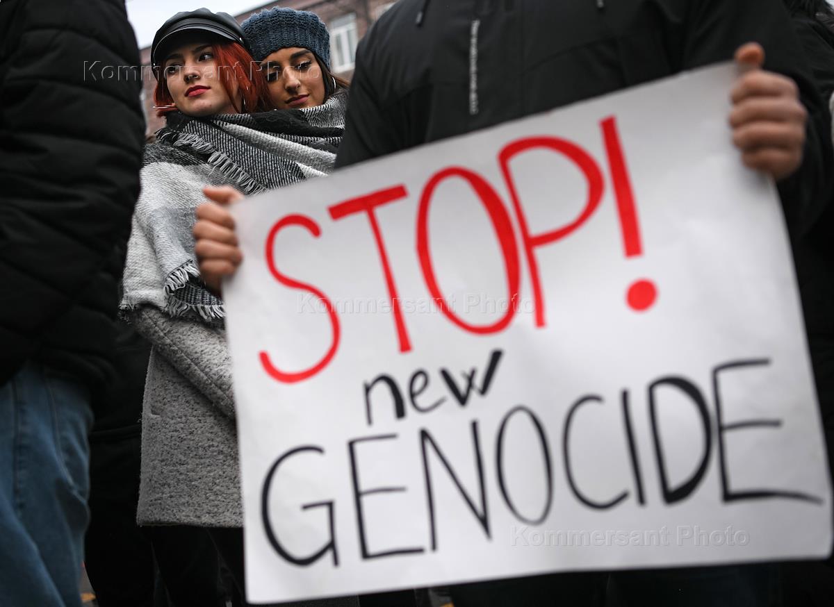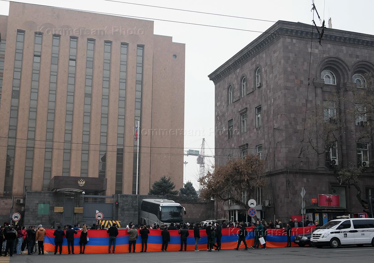Акция протеста у посольства России в Ереване с требованием помощи России в разрешении ситуации с блокированием Карабаха. Участники во время акции.