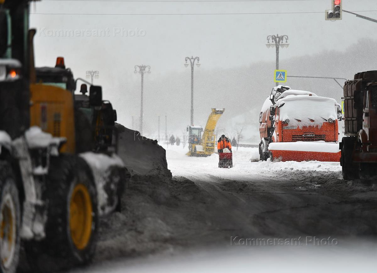 Genre photography. Snowfall in the city. Utility worker during snow removal.