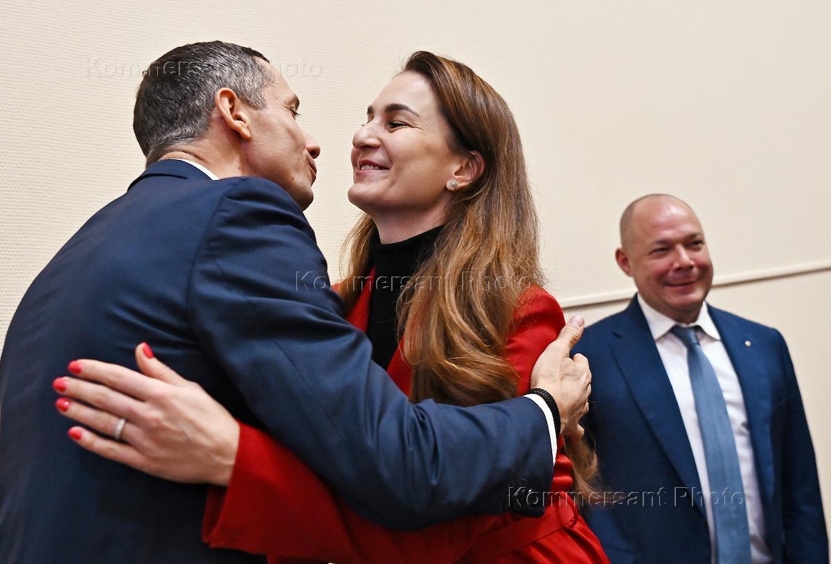 Ежегодное Олимпийское собрание в Олимпийском комитете России (ОКР). Спортивный директор Всероссийской федерации легкой атлетики (ВФЛА) Юрий Борзаковский (слева) и председатель комиссии спортсменов ОКР, олимпийская чемпионка по фехтованию Софья Великая (в центре) перед началом собрания.