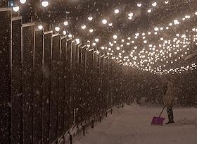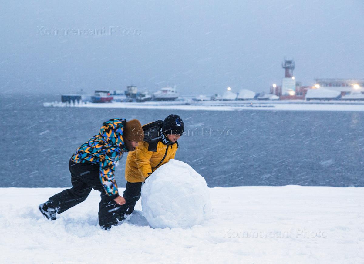 Жанровая фотография. Дети лепят снеговика во время снегопада.