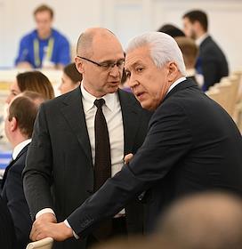 Заседание Государственного совета (Госсовета) России по вопросам реализации молодежной политики в современных условиях в Кремле. Первый заместитель главы администрации президента России Сергей Кириенко (слева) и руководитель фракции "Единая Россия" в Государственной думе России Владимир Васильев (справа) перед началом заседания.