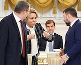 Заседание Государственного Совета (Госсовета) по вопросам реализации молодежной политики в современных условиях в Кремле. Слева направо: временно исполняющий обязанности главы Луганской Народной Республики Леонид Пасечник, председатель Совета Федерации России Валентина Матвиенко и временно исполняющий обязанности главы Донецкой Народной Республики (ДНР) Денис Пушилин перед началом заседания.