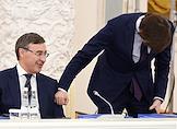 Заседание Государственного Совета (Госсовета) по вопросам реализации молодежной политики в современных условиях в Кремле. Министр науки и высшего образования России Валерий Фальков (слева) и министр просвещения России Сергей Кравцов (справа) перед началом заседания.
