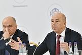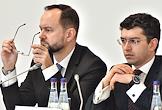 Заседание комиссии Госсовета России по направлению "Экономика и финансы" в башне "Око" в Московском международном деловом центре "Москва-Сити". Первый заместитель министра финансов России Леонид Горнин (слева) и министр финансов России Антон Силуанов во время заседания.
