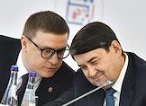 Заседание комиссии Госсовета России по направлению "Экономика и финансы" в башне "Око" в Московском международном деловом центре "Москва-Сити". Губернатор Челябинской области Алексей Текслер (слева) и помощник президента России Игорь Левитин во время заседания.