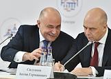 Заседание комиссии Госсовета России по направлению "Экономика и финансы" в башне "Око" в Московском международном деловом центре "Москва-Сити". Помощник президента России Игорь Левитин (слева) и губернатор Камчатского края Владимир Солодов (справа) во время заседания.