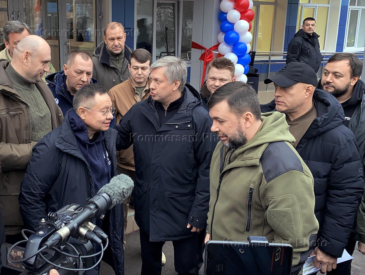Ситуация в Мариуполе во время проведения специальной военной операции на Украине. Торжественная церемония открытия школы №27 в Мариуполе. Временно исполняющий обязанности главы Донецкой Народной Республики Денис Пушилин (в центре) и министр строительства и жилищно-коммунального хозяйства России Ирек Файзуллин (третий справа) во время церемонии.