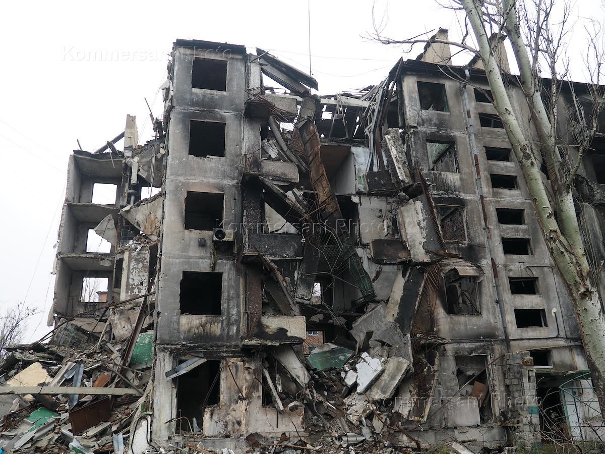 Ситуация в Мариуполе во время проведения специальной военной операции на Украине. Жанровая фотография. Разрушенный жилой дом после боевых действий в городе.