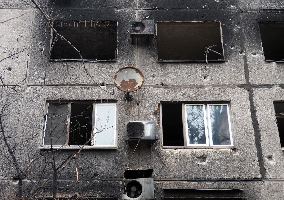 Ситуация в Мариуполе во время проведения специальной военной операции на Украине. Жанровая фотография. Сгоревший дом после боевых действий в городе.