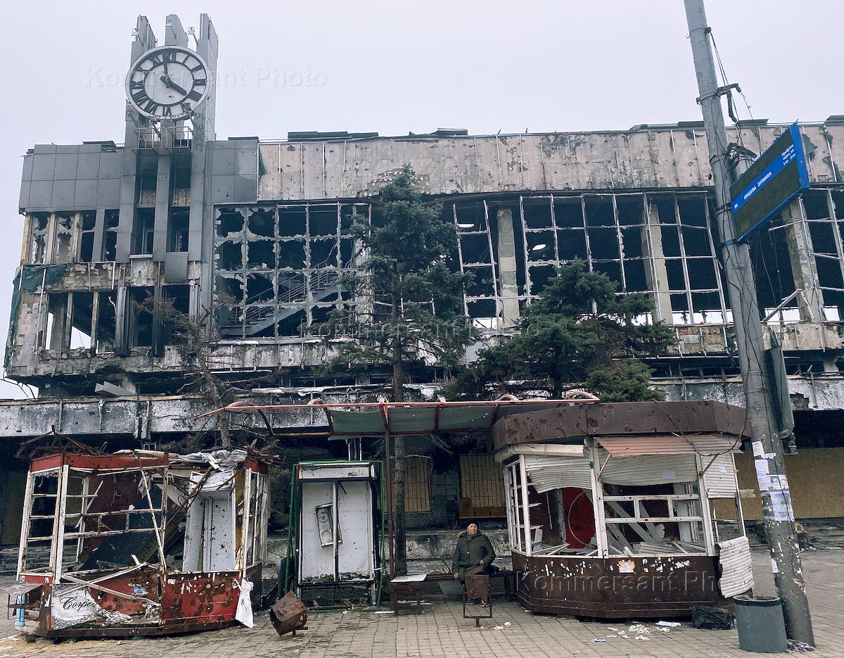 The situation in Mariupol during a special military operation in Ukraine. Genre photography. The destroyed building of the railway station after the fighting in the city.