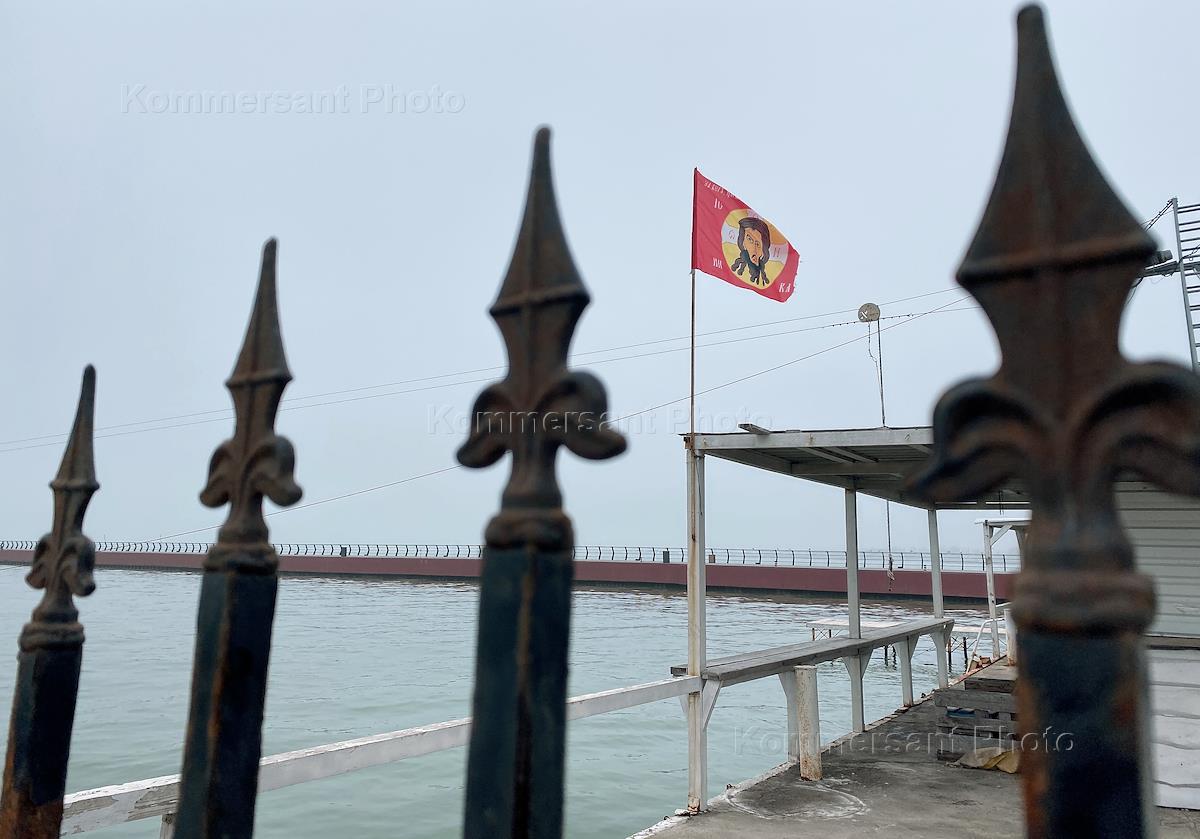 Ситуация в Мариуполе во время проведения специальной военной операции на Украине. Жанровая фотография. Набережная Азовского моря. Флаг с изображением Иисуса Христа.