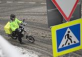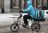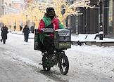 Жанровая фотография. Курьер службы доставки "Яндекс Еда" едет на мопеде по зимней улице.
