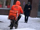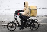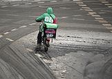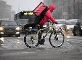 Жанровая фотография. Работа курьерских служб. Курьер службы доставки еды "Кухня на районе" на велосипеде.