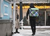 Жанровая фотография. Работа курьерских служб. Курьер службы доставки ресторана "Много лосося" во время доставки заказа.