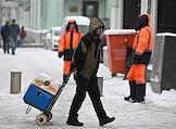 Жанровая фотография. Работа курьерских служб. Мужчина с фруктовой коробкой на тележке идет по заснеженной улице.