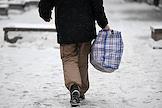 Жанровая фотография. Мужчина идет по улице с клетчатой сумкой.