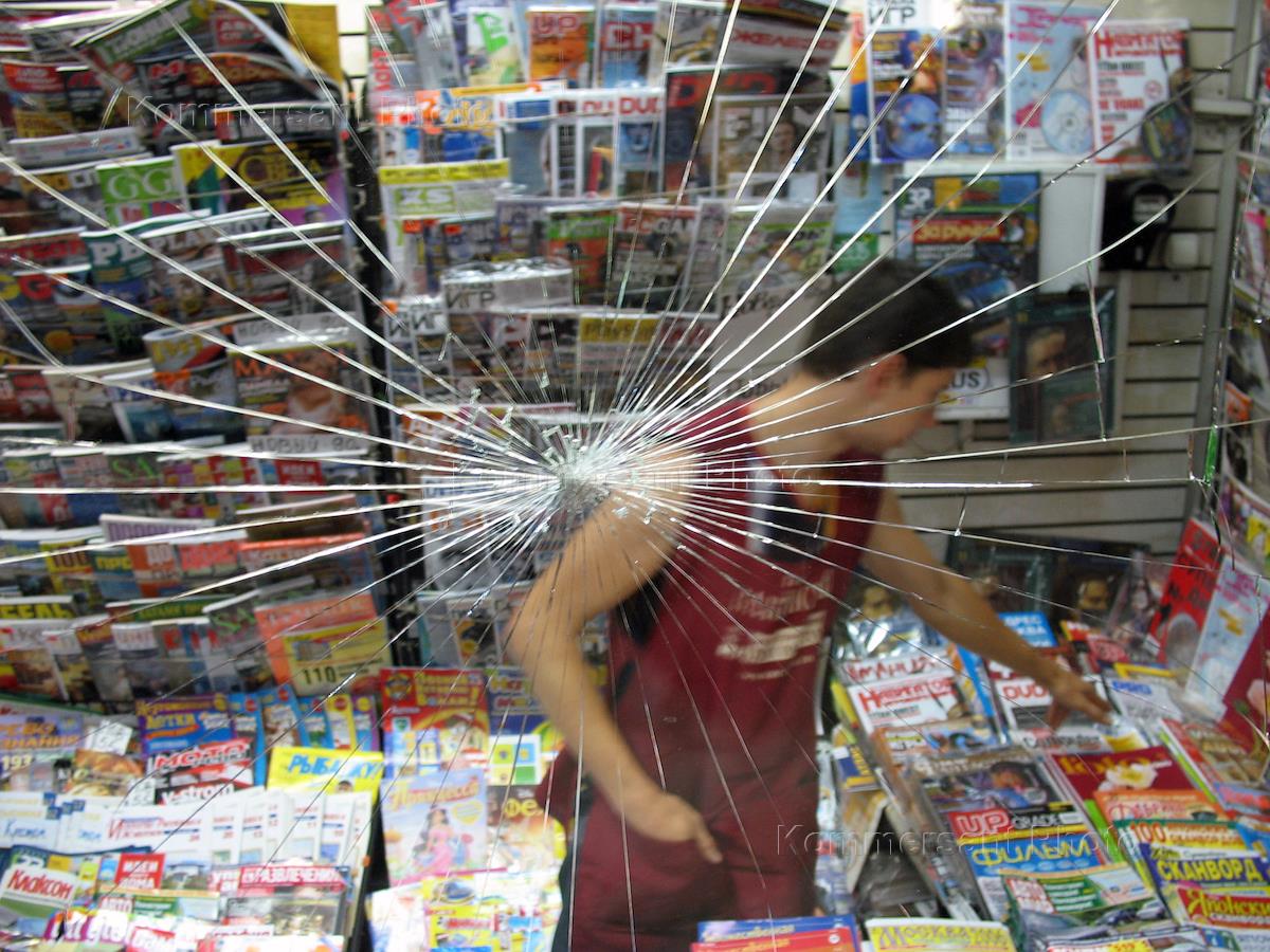 Продавец в павильоне по продаже печатной продукции. Разбитое стекло витрины.