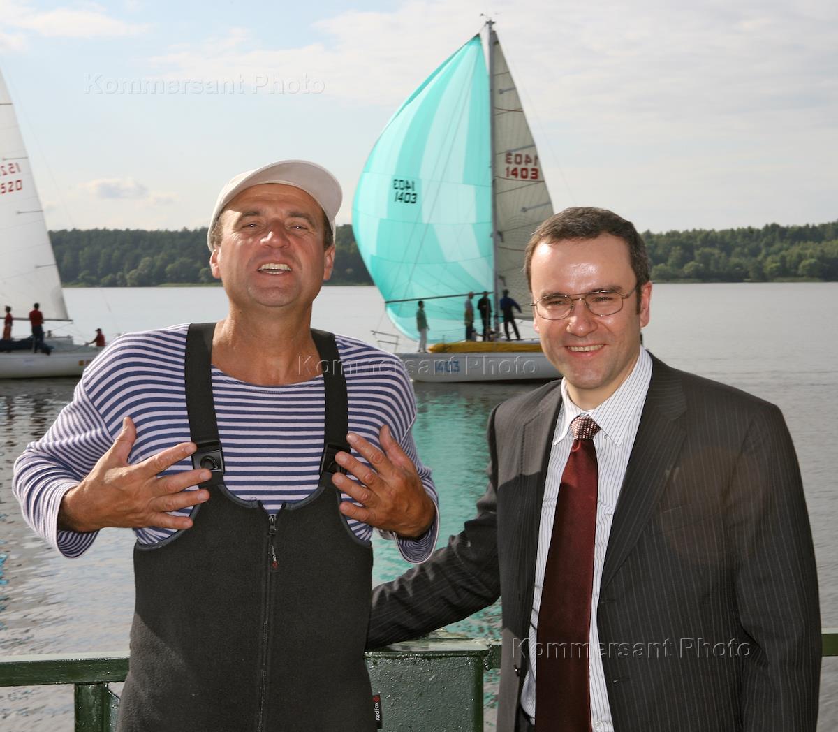 Капитан яхты "Ласточка" Николай Ковалев (слева) и губернатор Тверской области Дмитрий Зеленин (справа) на церемонии открытия Пятой межрегиональной Верхневолжской парусной регаты на приз губернатора Тверской области. Регата прошла в акватории Московского моря в Конаковском районе Тверской области.