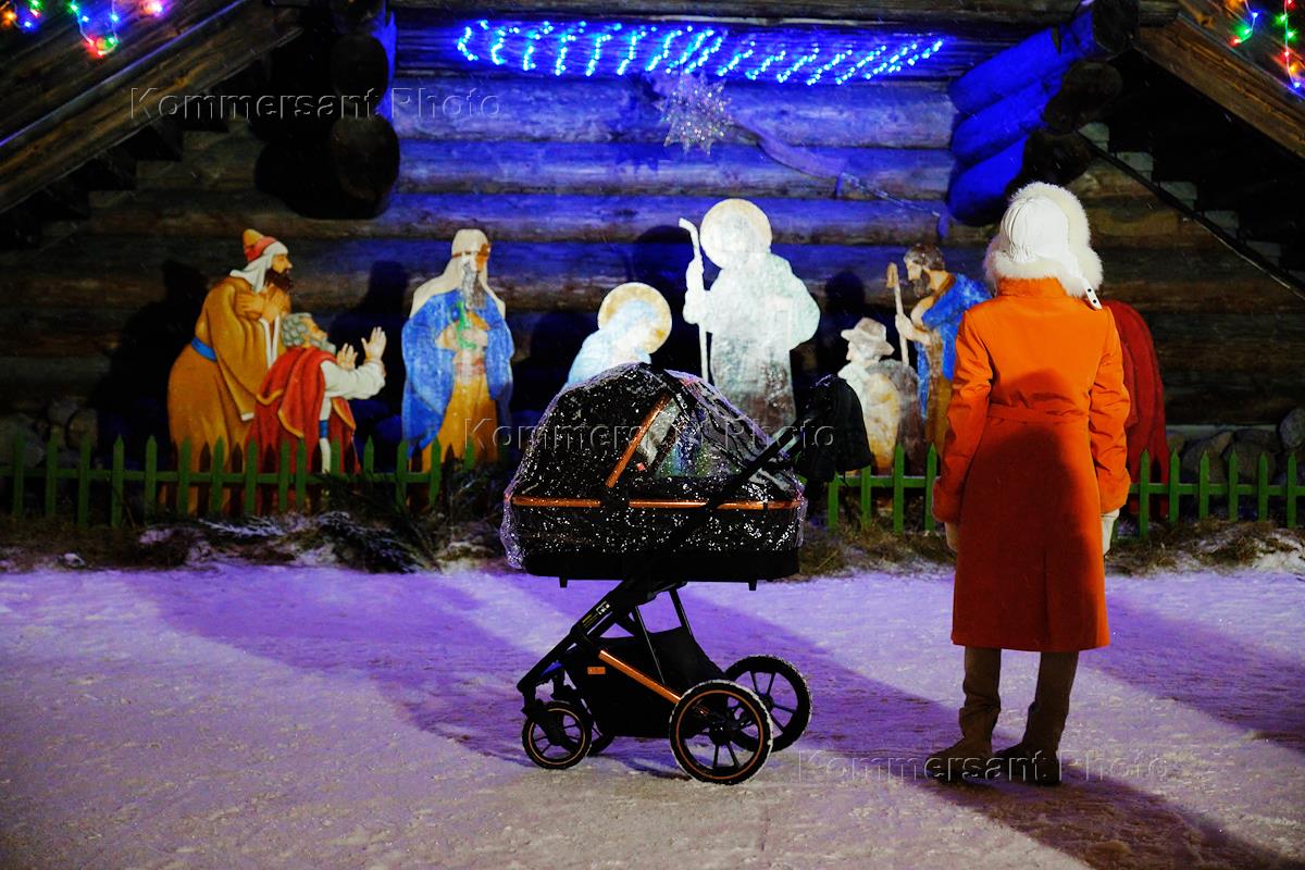 Богослужение Рождественского Сочельника в храме Покрова Пресвятой Богородицы в Невском лесопарке (усадьба Богословка). Жанровая фотография. Верующие перед храмом.