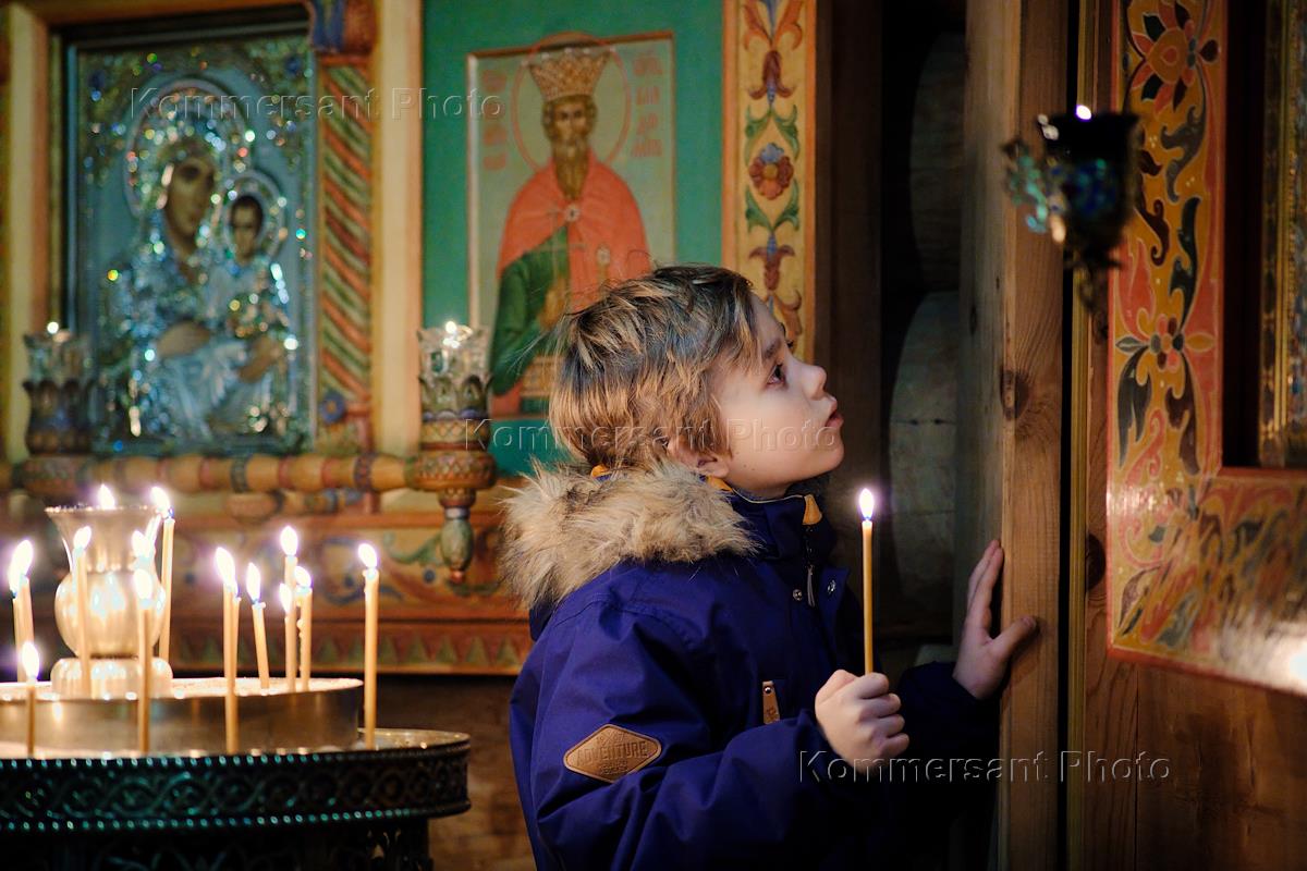 Богослужение Рождественского Сочельника в храме Покрова Пресвятой Богородицы в Невском лесопарке (усадьба Богословка). Жанровая фотография. Верующие во время богослужения.