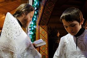 Богослужение Рождественского Сочельника в храме Покрова Пресвятой Богородицы в Невском лесопарке (усадьба Богословка). Священнослужители во время богослужения.