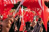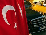 Встреча президента Турции Реджепа Тайипа Эрдогана с жителями Анталии. Жанровая фотография. Автомобиль "Мерседес" у флага Турции.