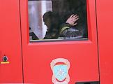 Пожар в жилом доме на улице Дмитрия Ульянова. Сотрудники МЧС России в кабине автомобиля на месте происшествия.