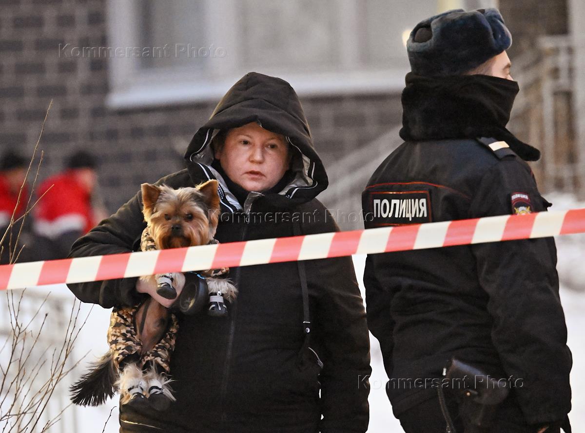 Пожар в жилом доме на улице Дмитрия Ульянова. Женщина с собакой и сотрудник полиции на месте происшествия.