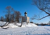 Виды Боголюбово. Храм Покрова на Нерли. Жанровая фотография. Лошади запряженные в сани на берегу реки Нерли.