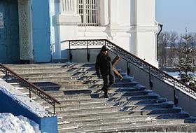 Виды Свято-Боголюбского монастыря. Жанровая фотография. Мужчина спускается по ступенькам собора в честь Боголюбской иконы Божией Матери.
